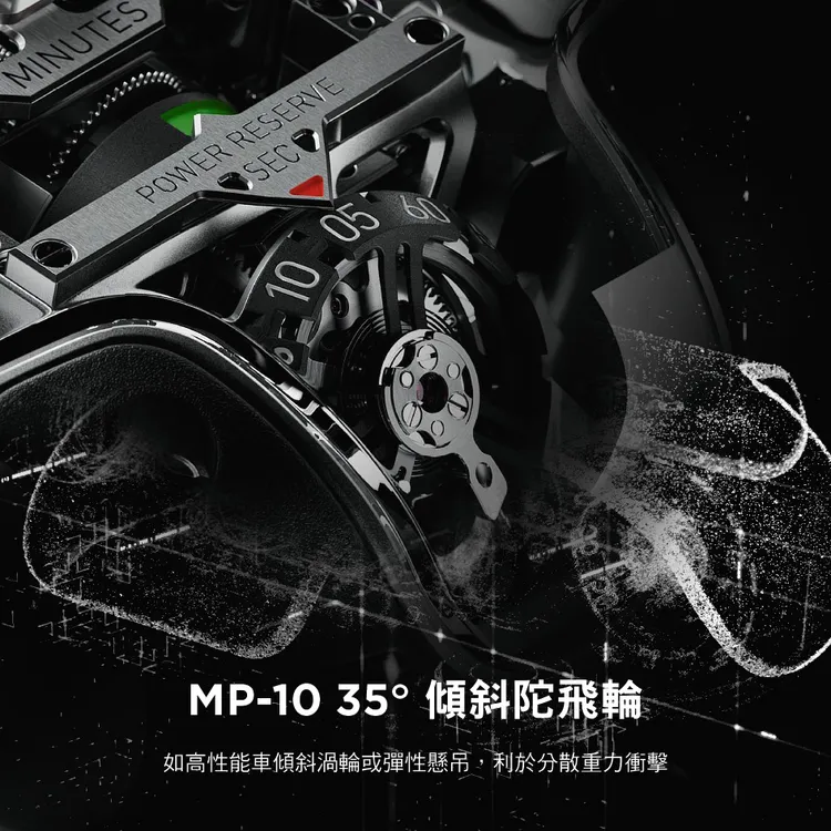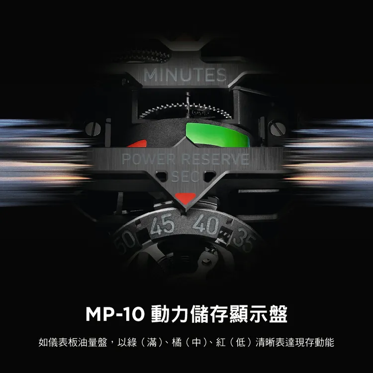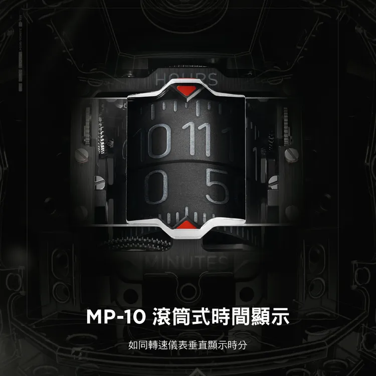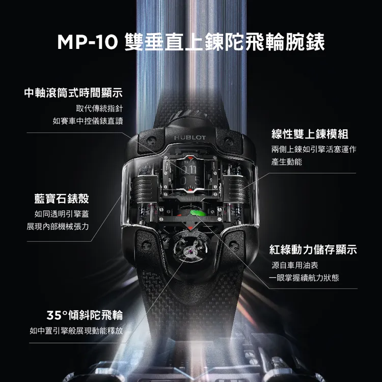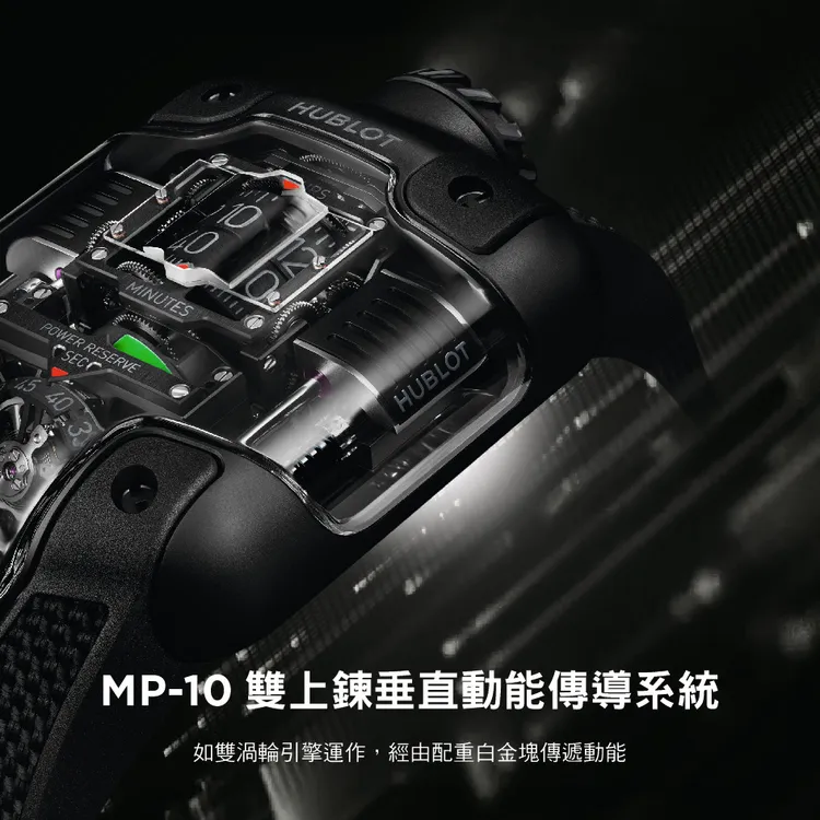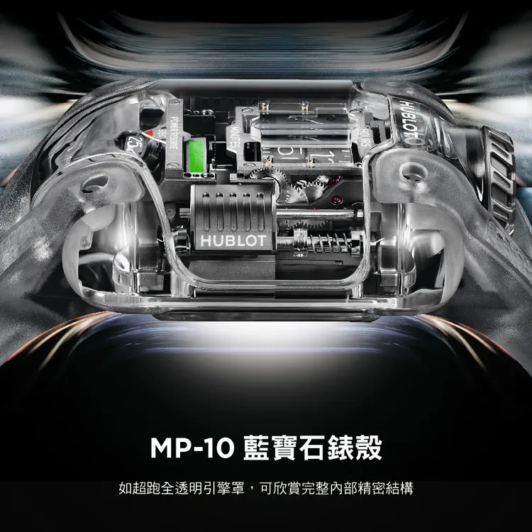 MP-10的靈感取材自超跑的核心引擎,機芯設計彷彿將一具迷你F1動力系統封存於手腕。內部搭載HUB9013自動上鍊機芯,由592枚零件與66顆寶石精密組構而成,所有關鍵元件皆沿著中央軸線垂直排列,帶來強烈的機械雕塑感。