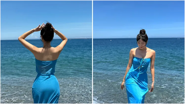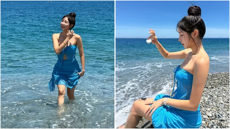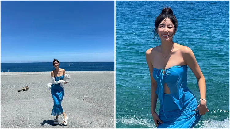 中華職棒台鋼雄鷹啦啦隊「Wing Stars」成員安芝儇,擁有巨乳細臀S型好身材,受封「真人版娜美」,她也經常在社群平台上分享美照。23日她在IG上分享她在花蓮海邊踏浪的美照,只見她穿著藍色薄紗小洋裝,胸前用綁帶繫住巨乳,好身材一覽無遺。