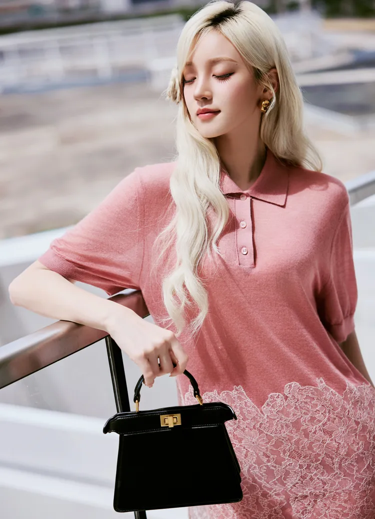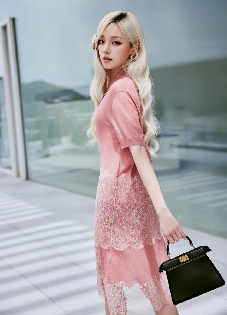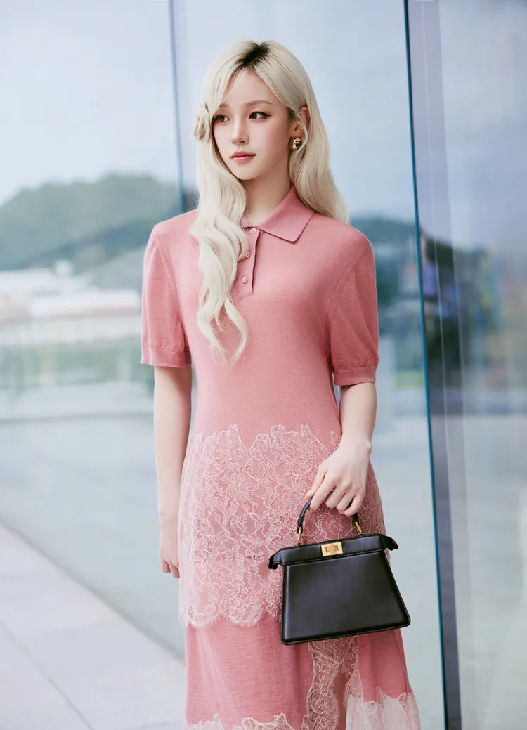 照片中可見她以一頭金髮,搭配粉色2025秋冬女士系列新裝,與黑色的Peekaboo ISeeu包款,化身溫婉浪漫的「粉色芭比」。