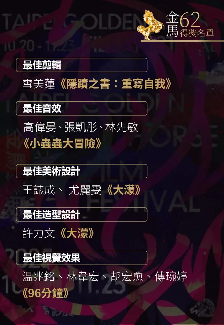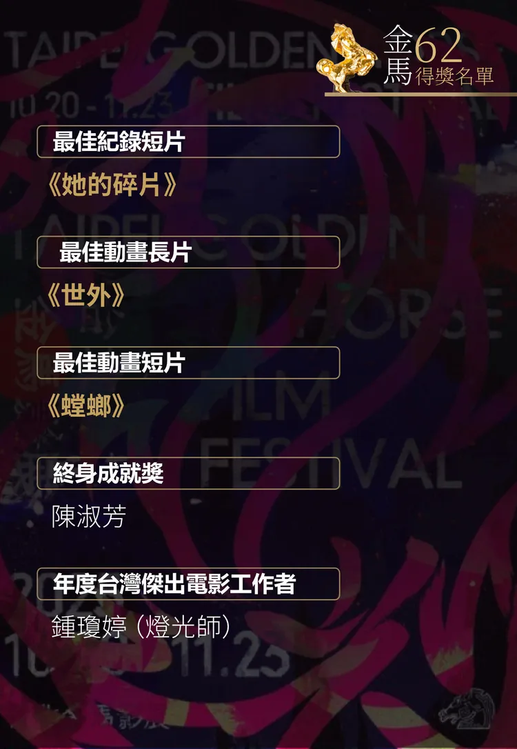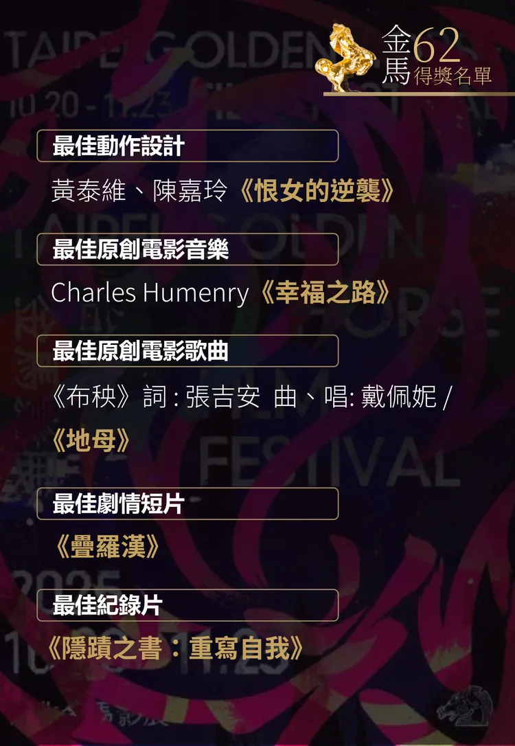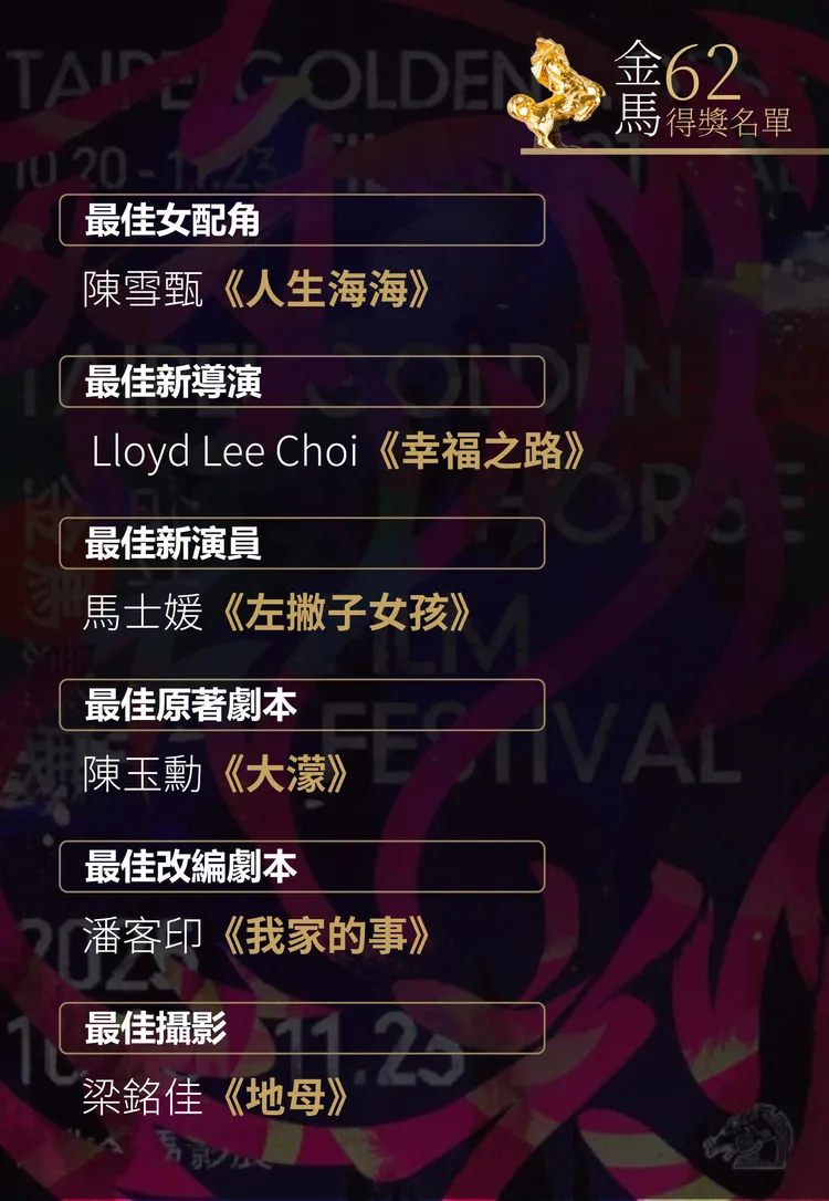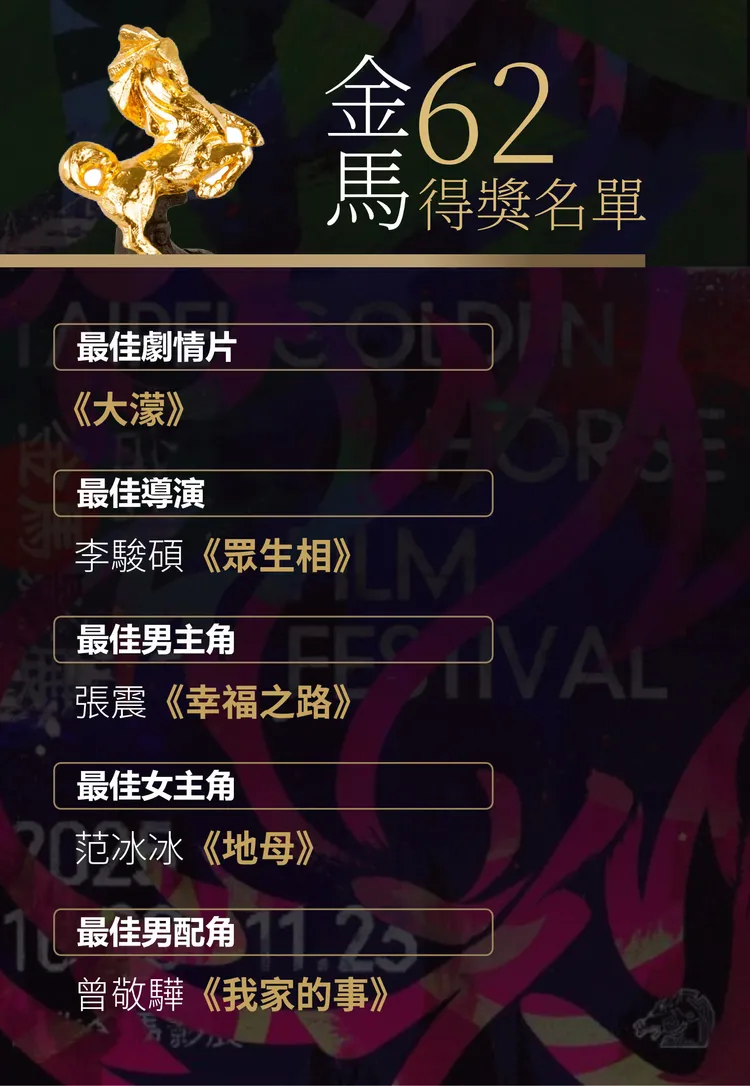 張震憑《幸福之路》2度稱帝,上台直呼:「又來了,非常開心,謝謝金馬獎評審對我的肯定,今年的每個人真的都很棒。」他說這次用非常放鬆的狀態去演戲,一度被路人誤認是外送員,笑說「成功亂入外送員生活!」低調的他難得提家人,「謝謝我的太太女兒,她現在蠻辛苦的,我常常不在家,謝謝我的父親張國柱,他是演員,他帶我進入認識電影,讓我從13歲出道到現在,不斷相信電影、熱愛電影,我要獻給所有熱愛的電影的我們」。