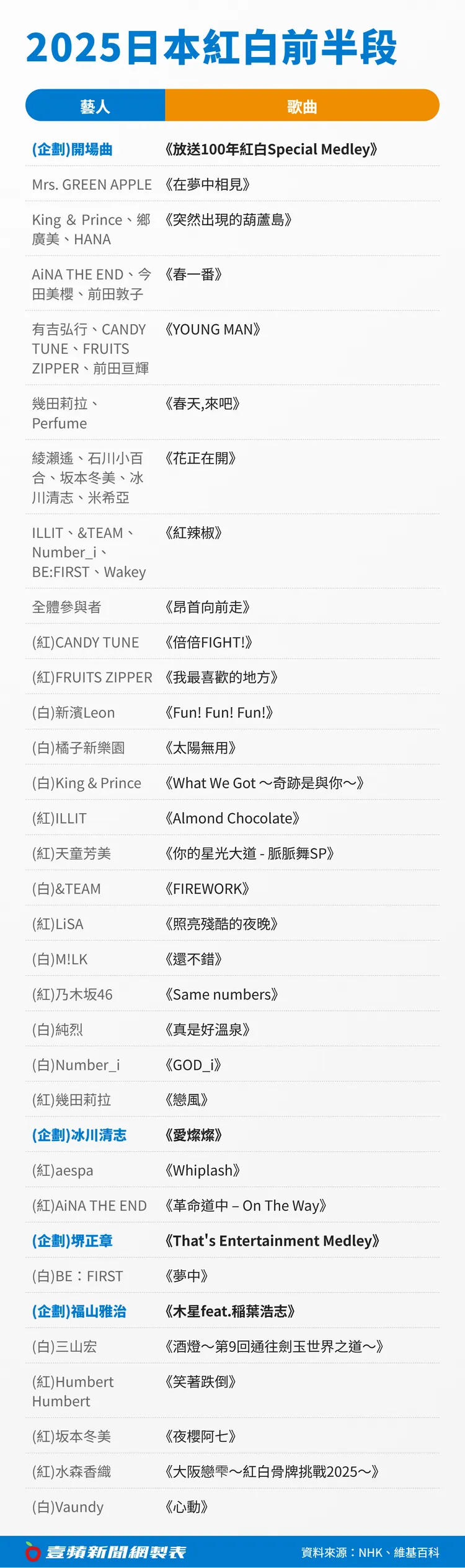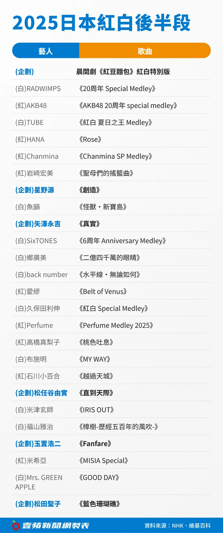本次《紅白》由有吉弘行、綾瀨遙、今田美櫻、主播鈴木奈穗子主持,將於台灣時間12月31日晚上6點20分播出。