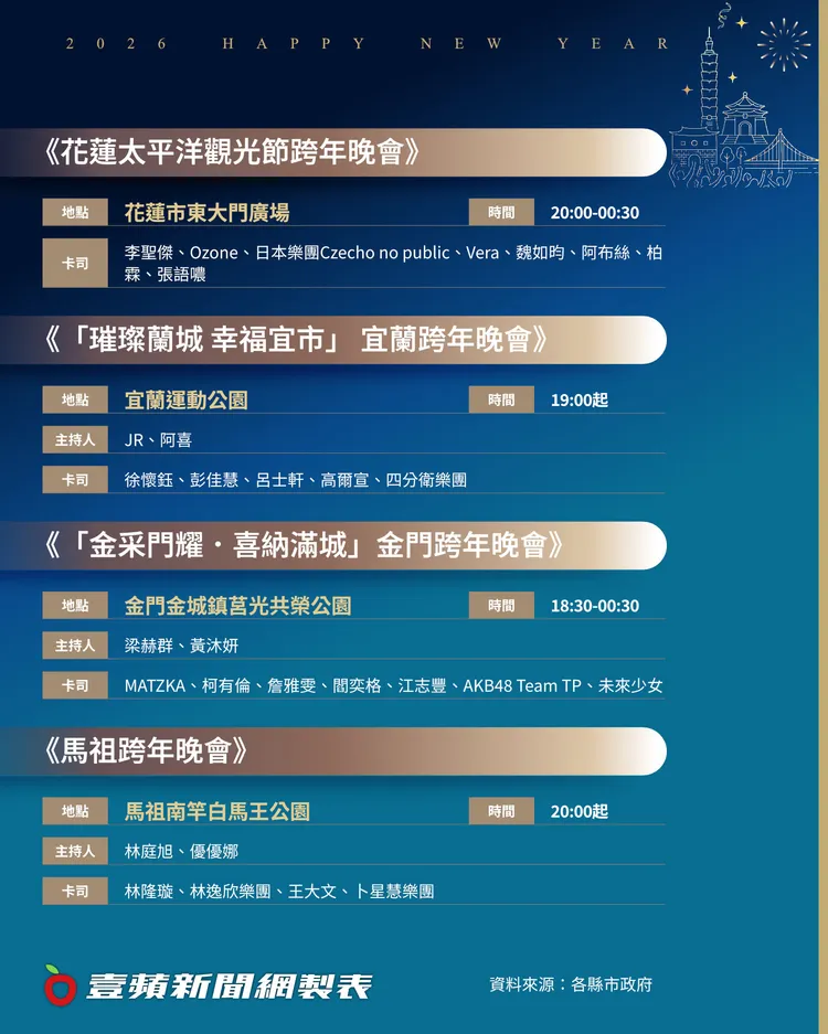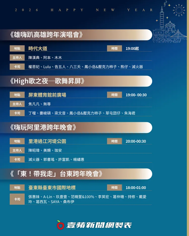 「2026台東跨年晚會 東漂去旅行:東!帶我走」雖沒有「韓流」來襲,不過這次由天后張惠妹(阿妹)坐鎮故鄉壓軸跨年,歌王歌后級好友齊聚一堂,攜手 A-Lin、玖壹壹、范曉萱&100%、李英宏、葛仲珊、持修等金曲常客,帶領數萬民眾迎接 2026 年第一道曙光。