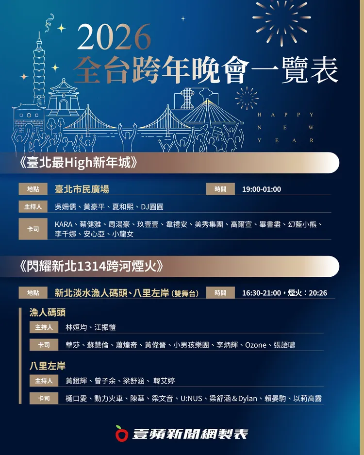「台北最High新年城-2026跨年晚會」年集結多組獨家亮點卡司,陣容涵蓋韓流巨星、金曲實力派與新世代音樂勢力,共13組豪華卡司接力登台,包括金曲創作天后蔡健雅、金曲創作才子韋禮安、李千娜、Bii 畢書盡、GENBLUE幻藍小熊等人,其中最引人注目的還是睽違12年重返台灣舞台的韓流傳奇女團KARA,消息一出,引發粉絲熱烈討論。