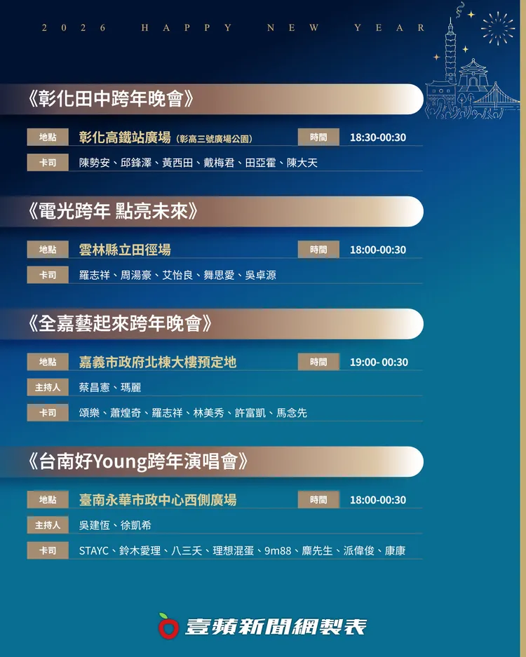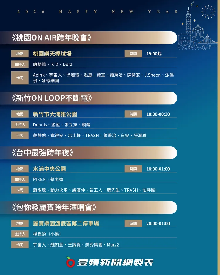 「2026桃園ON AIR跨年晚會」由韓國超人氣女團「Apink」現身桃園壓軸演出,還有金曲樂團「宇宙人」跨後獻唱。整個盛會油11組藝人接棒演唱,包括全能才女「Vivian Hsu徐若瑄」、金曲製造機「蕭秉治」、大勢情歌王「陳勢安」、唱跳天后「温嵐」、音樂才子「YELLOW黃宣」、金曲樂團「宇宙人」、流行樂團「icyball冰球樂團」、R&B天菜「J.Sheon」、新世代創作男孩「派偉俊Patrick Brasca」、新生代女團「HUR+」。