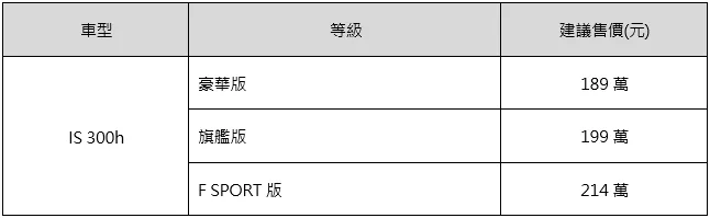 新款 IS 300h 即日起於台灣市場正式上市,提供豪華、旗艦及 F SPORT 共三種等級編成,售價自 189 萬元起,持續鎖定中大型豪華運動房車級距的核心買家族群。
