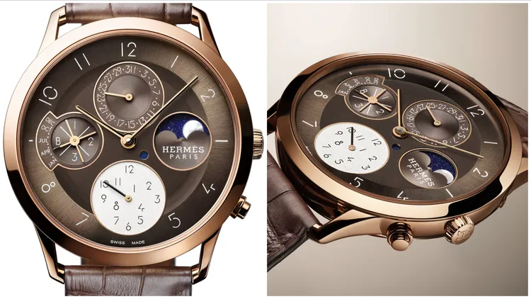 Slim d’Hermès系列是由Philippe Delhotal所構思的設計,捨去多餘修辭,回歸線條與比例的本質,讓高度複雜的製錶工藝,在極簡輪廓中自然呼吸。錶盤視覺採用平面設計師Philippe Apeloig專為此系列打造的字體,帶有間距節奏的阿拉伯數字,與深棕色中央盤面形成細膩對話。