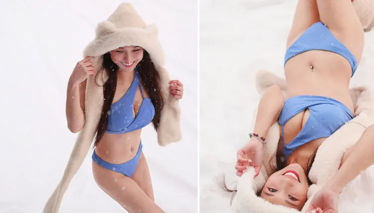 她無奈笑說「為什麼剛好我拍的時候是超級暴風雪」,在拍照過種只求快狠準,穿著比基尼跑進雪地後,馬上躺下來擺出各種專業pose,攝影師不斷按快門,她冷到彈跳,卻又被攝影師推倒在雪中,很快再補幾個畫面,隨即趕快把她從雪地中拉起身,2人一起逃進室內,她轉身時露出屁股蛋,雖然冷得要死,看到拍照效果這麼好,想必覺得一切都很值得。