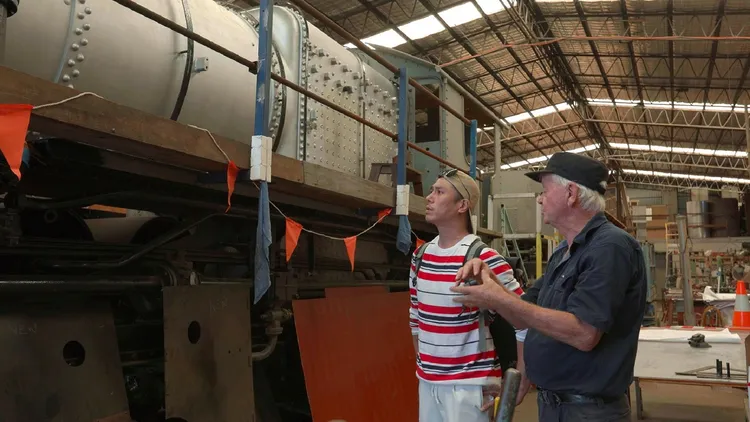 莊凱勛搭上從墨爾本一路往北300多公里的懷舊慢速列車深入澳洲內陸。當看到復古木質車廂的瞬間,他忍不住驚呼:「好漂亮啊,全都是木構的,像走進時光隧道,很有西部拓荒電影的感覺。」這些從1923年延續至今的古老車廂,瞬間勾起莊凱勛最深刻的童年記憶。