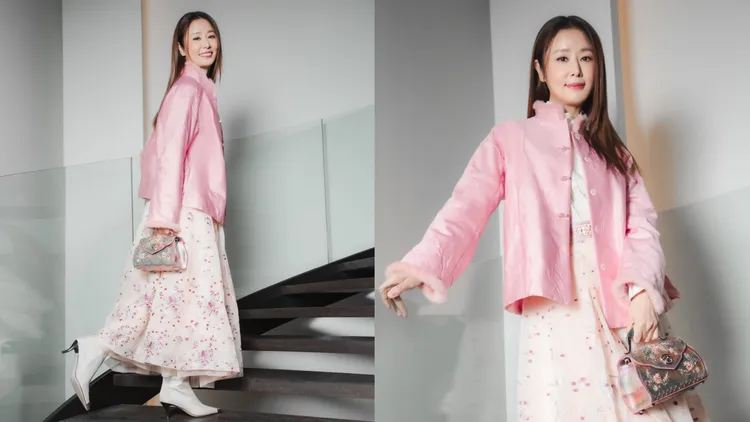 這些情緒被細膩地轉譯進服裝之中,林心如於影片中演繹2026新年限定造型,粉色緹花棉襖背心以中式線裝書為靈感,線條內斂而耐看,領口的貂毛細節與玉石釦飾,在舉手投足間流露溫潤氣質;拍照時則以棉襖外套搭配開版緹花長裙,層層紋樣如同節慶情緒自然鋪展,呈現剛柔並存的當代女性樣貌,都能新春時節穿出溫潤之美。