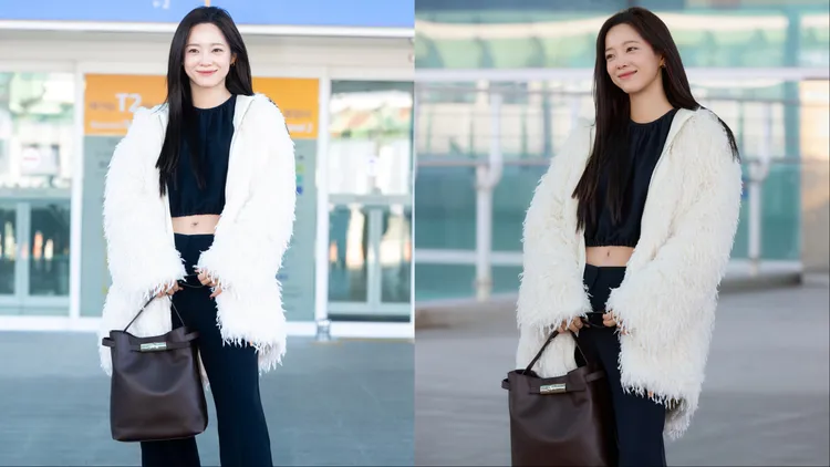 身為法國精品Longchamp品牌大使的金世正,此次全套機場造型皆出自品牌春季系列,相當搶眼的人造皮草連帽大衣,以象牙白長毛絨溫潤包覆,為冬日行頭注入暖意;內裡則搭配黑色雪紡圓領上衣,短版剪裁讓她在寒冬中辣露一截蠻腰,輕盈視覺同時也減輕外套帶來的厚重感;至於下半身則選用微寬鬆剪裁的長褲與黑色鱷魚壓紋牛皮短靴,將慵懶都會氣息與率性風格完美揉合。