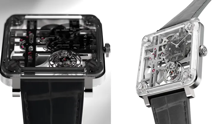這款新作徹底革新了Bell & Ross著名的方形錶殼,以精鋼錶環搭配正、反兩面的藍寶石玻璃,構成一具極致簡約的透明骨架。這項設計讓錶殼與機芯合而為一,透過四顆螺絲貫穿固定,展現結構的力與美。品牌創意總監Bruno Belamich從荷蘭畫家Piet Mondrian的幾何抽象與建築師Charlotte Perriand的簡練功能中汲取靈感,將機芯夾板打造如藝術網格,每一枚齒輪與寶石都宛如懸浮於真空之中。