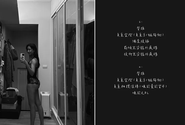 她透露自己的臀腿訓練菜單相當簡單,每週固定兩次臀腿日,交替進行兩套菜單內容。每個動作皆依循「漸進式超負荷」原則進行,每項動作四組、每組10下,當四組都能穩定完成時便增加重量。她特別強調加重量的重要性,否則很難看到明顯成效。