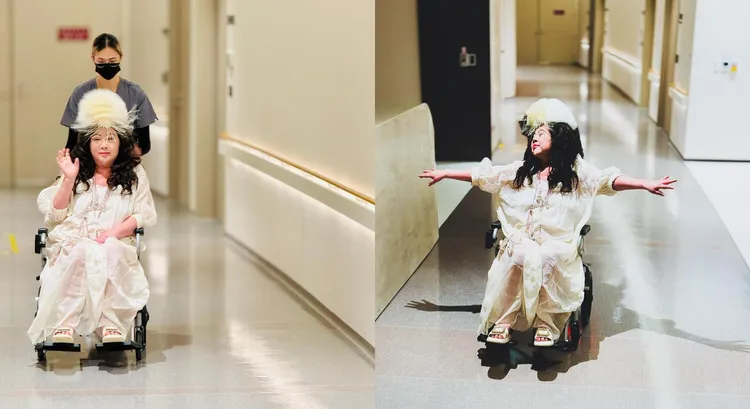 陳文茜頭戴白色帽飾、穿著白色洋裝,坐在輪椅上停在醫院走廊中央,張開雙手,擺出宛如飛翔的動作,透露「在台大癌醫,坐輪椅當飛鳥」,她也感嘆表示「歲月易逝,一絲不剩。別辜負任何一個當下」。
