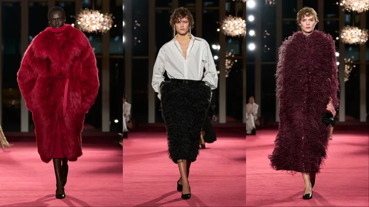 在服裝輪廓呈現上,2026秋冬系列實踐了「戲劇化極簡」的哲學,在經典衣櫥單品中注入當代靈魂,除了個是毛絨、羽毛外套成為造型焦點,也透過斜裁技術與細膩垂墜工法,讓粗花呢與法蘭絨等傳統面料煥發輕盈流動感。晚裝設計則打破常規,在率性與華麗之間取得平衡,例如帶有拖尾的長褲造型,或是融合奢華刺繡的中性襯衫,甚至將雞尾酒禮服的拖尾轉化為可披裹的多變設計,賦予晚宴穿搭更多實用與創意的層次。
