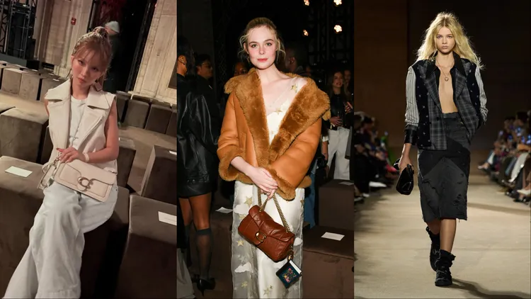 而皮革手袋則聚焦於橫式輪廓,無論是修長的Kisslock Frame肩背包,或是致敬典藏設計的Turnlock Haversack,皆運用品牌經典轉扣與鎖扣細節,柔軟Turnlock郵差包則推出大尺寸,成為秀場焦點。鞋履與飾品配件同樣呼應多變街頭文化,全新無鞋帶滑板鞋以70年代為靈感,將消防扣環等金屬件融入鞋面設計,提供高低筒與多樣色選。首飾部分則轉向神祕天體主題,以細膩雕塑工藝打造金銀星辰月亮的耳環與胸針;此外,皮革領帶、銀色飛行員眼鏡以及繫上銀鍊的虎眼石印章戒,皆為整體造型增添了不羈氣質,完美勾勒出COACH本季既復古又具前瞻性的美學藍圖。