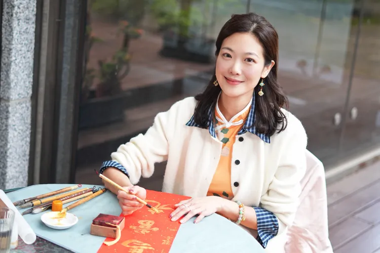 姚采穎接受《壹蘋》專訪,當場揮毫流暢又明快,設計對聯「壹馬當先」、「蘋心靜氣」,非常用心送給《壹蘋》讀者最真摯的祝福。為了這場訪問,寒風中她敬業地脫去外套,只穿單薄貼身高衩旗袍,頻打寒顫仍專業擺Pose,名模架式不減,優雅又美麗。
