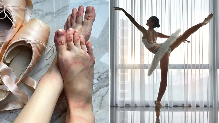 李元玲今天在threads分享兩張照片,一張是她練習芭蕾的優美舞姿,另一張卻是舞鞋裡雙腳的慘況,趾甲開裂、腳趾等多處破皮。