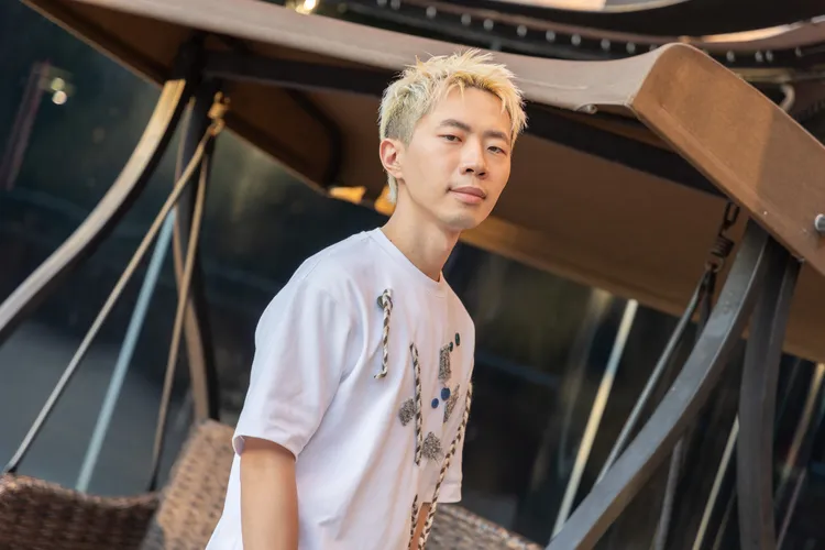 鄭興特別挑選被染色的白T,並準備多色鈕扣、繩子與碎步等,自認「手殘」、不會使用針線的他,改以膠水黏貼,他也建議粉絲可以使用熱溶膠黏貼、加強固定。鄭興為了遮掩白T被染上的淡藍色污漬,在污漬上以藍色漸層不一的鈕扣裝飾,並將剪成小塊的碎布,隨意黏貼在周圍,另拿剪刀在T恤上剪洞,將編織繩子穿入洞中,營造垂墜的交錯感,成品相當有設計感,又不失文青手作的質感,他表示:「很多衣服染色或有污漬就不會再穿了,透過這樣的方式改造,反而成為獨一無二的珍品,很適合推薦大家試試看。」