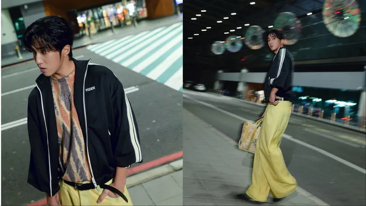 婁峻碩此次的機場時尚,選穿Onitsuka Tiger 2026春夏Denivita日製丹寧系列,以黑色立領寬鬆外套內搭綁染TIE-DYE短袖上衣,透過繽紛視覺堆疊層次,同時也打破黑色的沉悶感;下身則換上了超有辨識度的經典黃色丹寧寬褲,亮眼色彩與寬鬆剪裁相互呼應;搭配的黑色霧面皮革PLABALA鞋履、塗鴉設計托特包,同樣替全身造型勾勒出不羈率性輪廓。