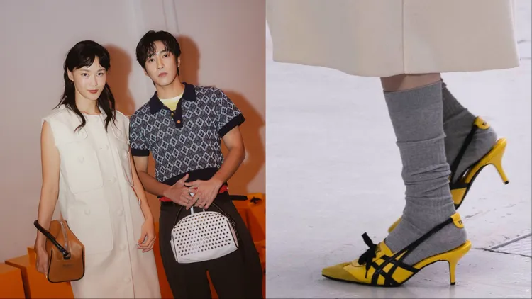 婁峻碩此次看秀展現層次穿搭功力,以2026春夏系列的菱格紋提花短版Polo衫內搭花卉印花水洗TEE,羊毛斜紋長褲內則是疊穿了紅色運動短褲,另選用粉色LAPLUNG鞋款與黑白拼接的KARATE BAG點綴穿搭。鍾瑶的造型重點則是1件米色長版背心,寬鬆廓型融合風衣設計靈感,腳踩華麗復古TIGER RODEANO高跟鞋、手提棕色KARATE BAG,完美演繹優雅洗鍊氣質。