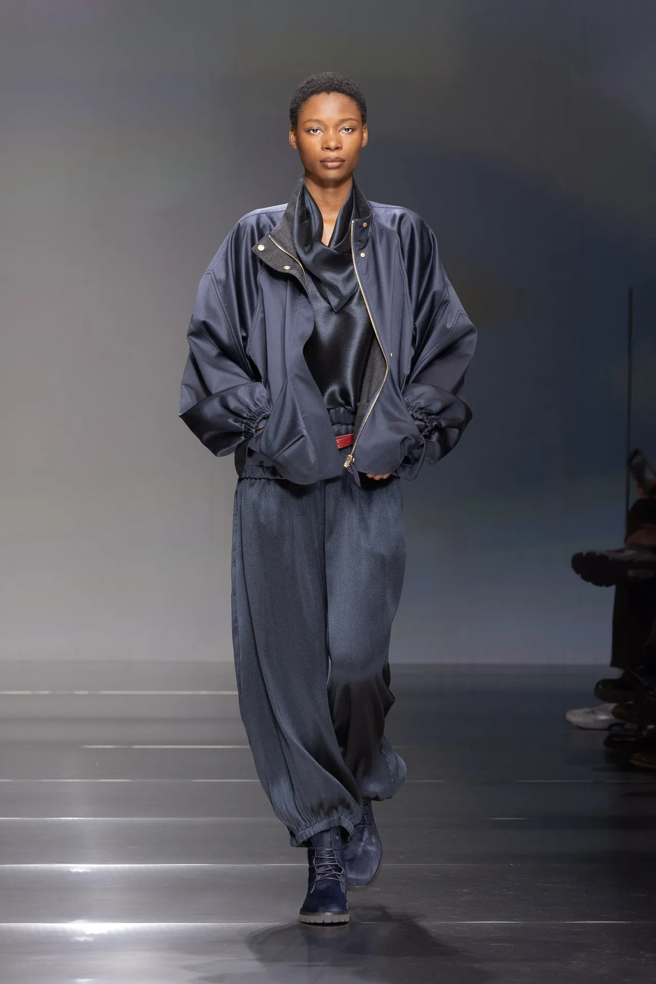設計輪廓在剛柔並濟中取得了微妙平衡,面料選用極具質感的法蘭絨、羊絨與絲絨,觸感豐富且細膩 。最讓人驚喜的是,設計團隊這次拿掉了夾克的墊肩,讓肩線呈現自然的圓潤感;而寬鬆的大衣與短版上衣則帶點解構主義的味道,輕柔地包裹著身軀。下半身搭配富有男性氣息的垂墜長褲,褲腳隨性地輕拂地面,這種從容自在感正是當今高段位穿搭的核心。