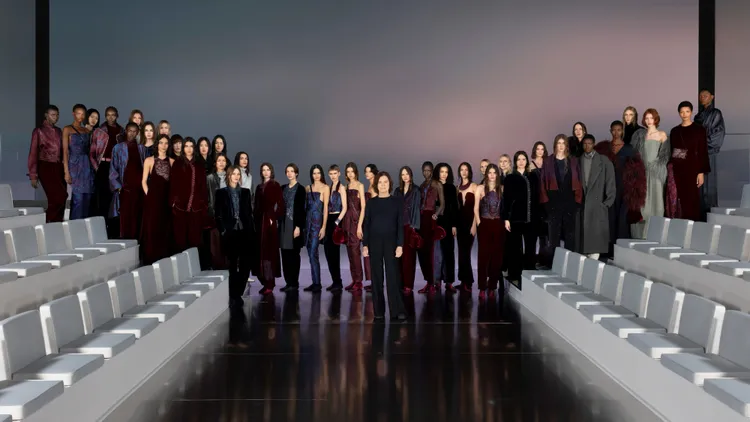Armani女性在往昔與當下之間從容切換,這種美感堅守本源且充滿生命力。大秀終章,伴隨著Mina未公開曲目《A costo di morire》的歌聲,全場向去年辭世的Giorgio Armani先生致以最高敬意。