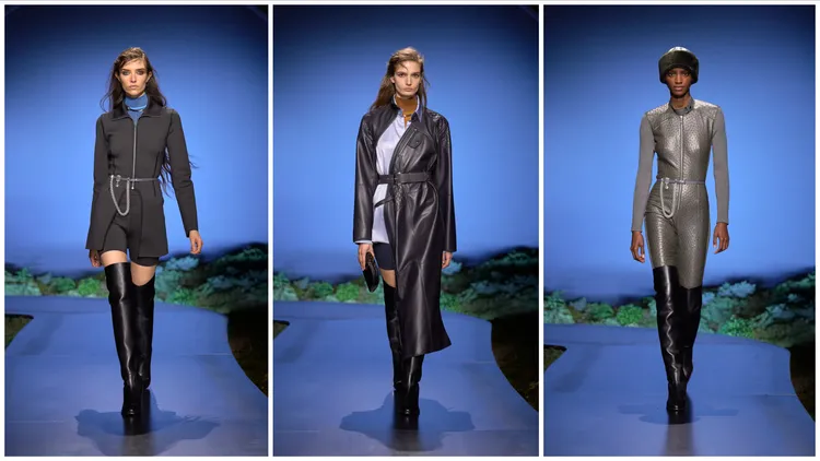 最令人驚喜的細節,莫過於那件墨藍色亮面皮革的騎士風格洋裝,隨著身體律動,拉鍊內層隱約顯露天藍色襯衫,如同在黑夜深處意外窺見一抹白晝,充滿超現實的美感。