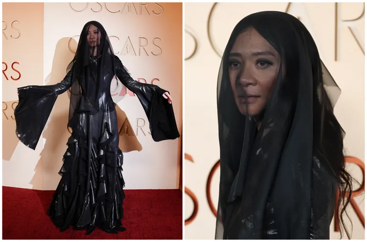 趙婷曾以《游牧人生》榮獲奧斯卡金像獎最佳影片與導演大獎,寫下亞洲女導演紀錄。她以聚焦莎士比亞與妻子遭逢喪子之痛的作品《哈姆奈特》 再度問鼎今年奧斯卡。有評論認為她這身陰鬱神秘的造型,也相當契合《哈姆奈特》電影本身的濃郁憂傷感。