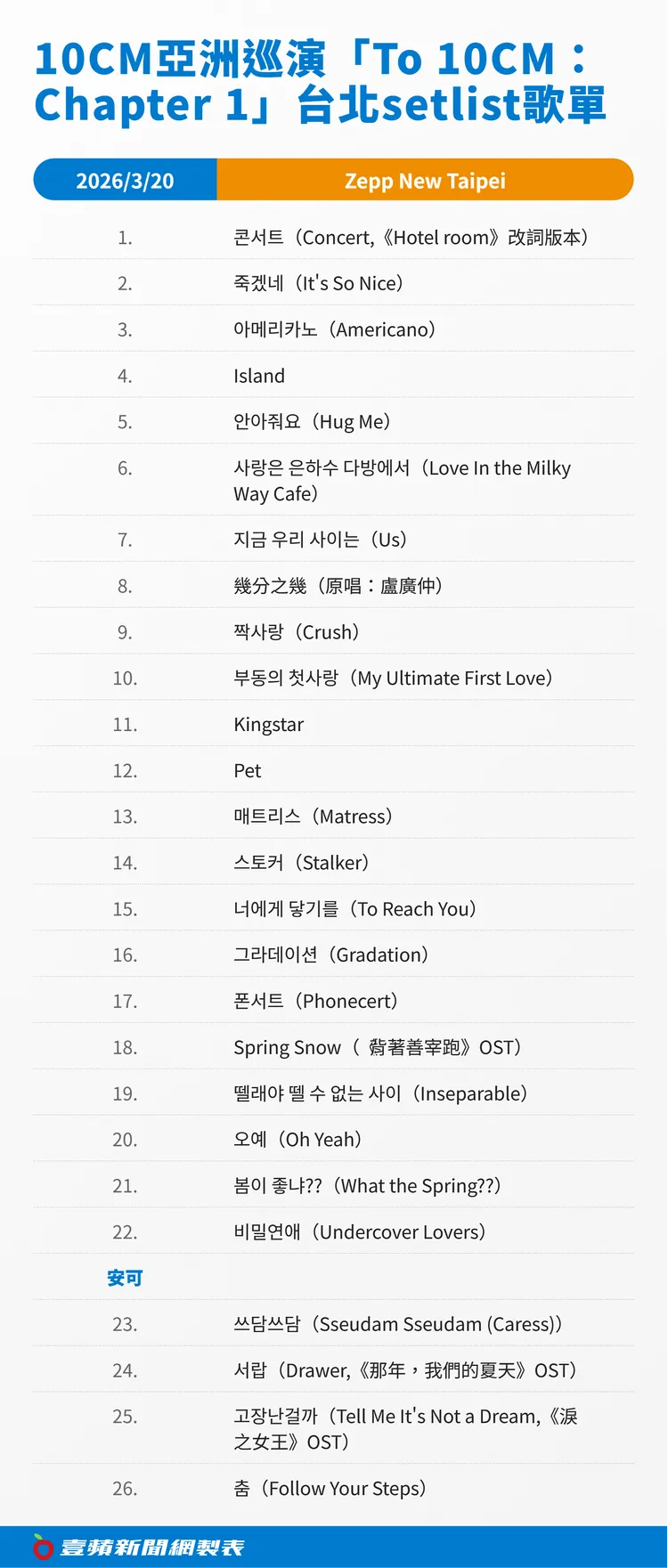 10CM亞洲巡演「To 10CM:Chapter 1」台北setlist歌單