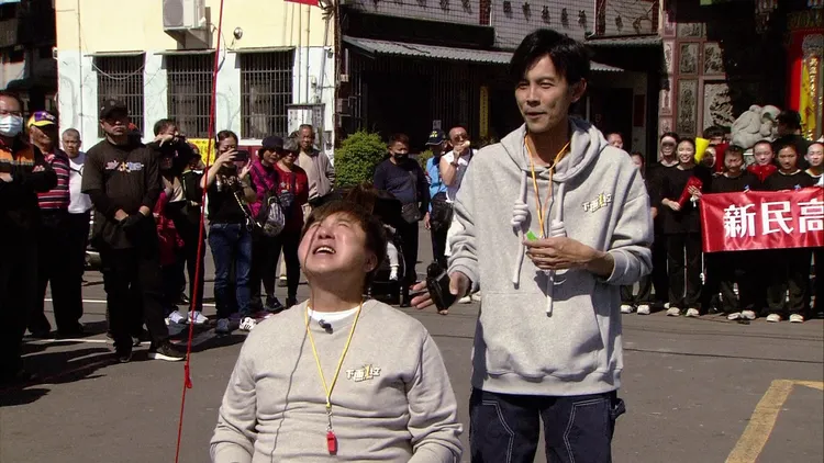 接下來的遊戲是「三府千歲祈福賽」,比賽採3男2女組隊,需連續完成三關挑戰,若在第三關失敗,則必須從第一關重新開始,最終以總秒數最短者勝出。第一關考驗柔軟度與協調性,參賽者坐在椅子上,腳踝綁上紅繩,透過滑輪將紅包袋垂下,必須抬腿並以嘴巴咬到紅包才算成功。胡瓜見狀信心滿滿,主動上場挑戰,沒想到哨音響起後卻屢試不成,即使全力抬腿仍無法成功,讓一旁原本準備進行下一關搬家具的藝人們,全都圍到沙發區看戲,場面笑聲不斷。最後董至成看不下去,直接上場代打,竟一口氣輕鬆完成挑戰。