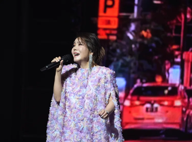 燈光流轉之中,她換上華麗紫色長禮服優雅登場,以《萬人迷的女明星》、《遺忘》揭開序幕。那熟悉又帶著歲月沉澱的嗓音,依舊溫柔卻極具穿透力,像一雙無形的手,輕輕把觀眾拉進她鋪陳的音樂世界。隨著情緒層層推進,她褪去華麗外衣,換上簡約長裙,唱起《著火薔薇》,在視覺與情緒的轉換之間,展現出更赤裸真摯的自己。