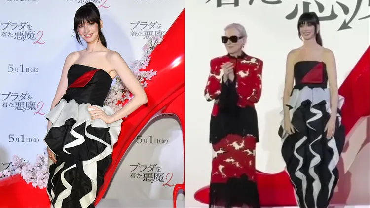 至於梅莉史翠普則選擇了Chanel 2026工坊系列登場,紅色印花外套搭配成套中長裙,最後墨鏡一戴上就相當有氣場,服裝於下襬處綴有黑色流蘇,尤其外套又在袖片拼接藍色細節,讓梅姨在舉手投足之間,不經意展現出服裝暗藏的各種亮點設計。融合法式優雅與強烈視覺張力的造型,似乎也呼應了她在劇中飾演的那位不怒而威、引領全球時尚脈動的惡魔總編身分。