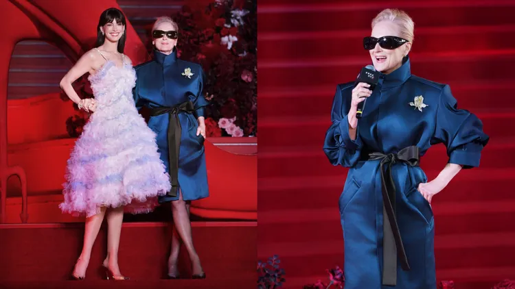 梅莉史翠普在電影中飾演「時尚女魔頭」,戲外的宣傳服裝也都用盡心思,像是早先在首爾記者會上選穿紅色PRADA套裝,首映會則改換上CELINE黑色褲裝,而昨晚上海宣傳時她穿上了一套寶藍色中式立領裙裝,搭配來自台灣的CINDY CHAO 藝術珠寶「四季楓葉胸針」及「建築戒指」。