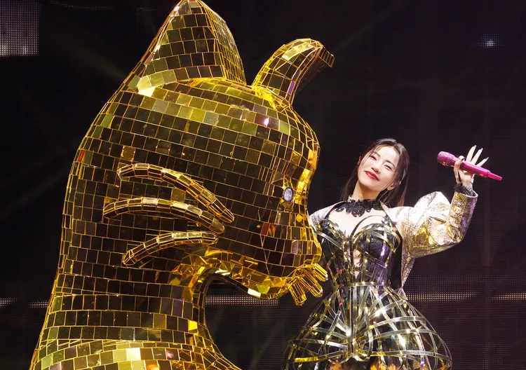 一開場她以「金耀氣勢女帝」造型華麗登場,站上3.5米高的巨型金色夜貓裝置,氣場全開領軍舞者嗨唱《夜遊》、《星期五晚上》,節奏一波接一波,讓歌迷從開場就嗨到不行。轉眼間,她換上蕾絲黑天鵝造型深情獻唱《你為什麼說謊》,柔與剛完美切換,唱功與舞台魅力雙重爆擊。