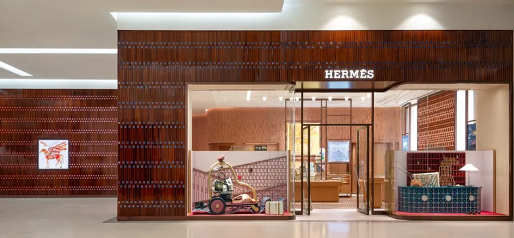 踏入一樓,空間色調像傍晚天光般慢慢展開,柔和中帶點深度。洋紅色細節穿插其中,替整體氣氛添上一點活潑。光線的安排顯得克制而講究,Grecques燈飾灑下溫潤亮度,讓右側配件區與左側香氛美妝自然被看見。空間裡還藏著以在地工藝打造的線材屏風,揉合了絲巾製作過程中留下的布料,織出帶有節奏感的層次,也讓材料多了一次被看見的機會。