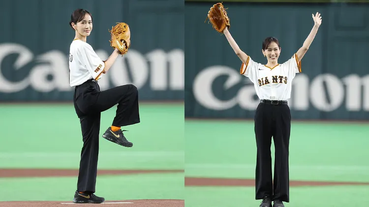 前田敦子28日身穿背號9號的巨人隊球衣,搭配俐落黑色長褲登場。同時她露出代表主場球隊的橘色襪子,並將頭髮束成丸子狀。站上開球區後,毫不猶豫地完成儀式。