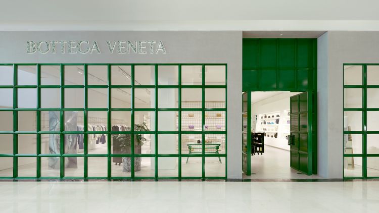 編織,是BOTTEGA VENETA的靈魂所在,高雄漢神巨蛋店門面以玻璃和鸚鵡綠色漆飾金屬格架搭組出的通透方塊,似讓傳承逾半世紀的工藝厚度,披上了更為摩登的面貌。推開嵌著琺瑯手把的大門,網狀的黃銅金屬層架,再次用截然不同的語彙,延伸了編織的主題,連整個試衣間的牆面,都被染著鸚鵡綠的小編織人造皮革包覆,成為空間中另類的自拍熱點。