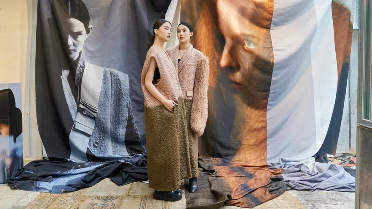 王汁把做衣服形容成剝石榴,要注入100分的耐心和執著,品牌每季的衣服,都試圖在用面料去陳述1個故事,當然2022秋冬也不例外。如古著般刻意做舊的溫暖感,是整個系列給人的第一印象,大量引入的毛氈、羔羊毛及馬海毛,伴隨著經過水洗、抓皺、吊染或植物染處理的面料,率先勾勒出游牧民族的飄泊感。版型是寬鬆而修長的,留給了多層次穿搭足夠的空間,絲絨拼接英國傳統格紋、毛呢拼接人造皮草等衝擊性的視覺對比,亦被一片式或三片圍裹式剪裁,交織成歌頌浪漫靈魂的肌理詠嘆調。