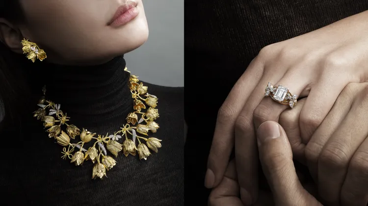 這10件將登場競標的TIFFANY珠寶,當中7件是由Jean Schlumberger所設計,其中的鬱金香項鍊以18K金與鉑金生動刻畫鬱金香花苞與枝葉被微風吹拂搖曳、交纏姿態,還有金質鑲鑽蜻蜓飛舞穿梭其中,表現大自然間的澎湃生命力;而由Jean Schlumberger在1965年為TIFFANY設計、風靡至今的經典「石上鳥」系列胸針,也入列這場拍賣會,其鑲嵌61.21克拉黃水晶主石,佇立黃水晶上頭的鳳頭鸚鵡則鑲滿鑽石、眼睛點綴紅寶,樣貌極具靈氣。