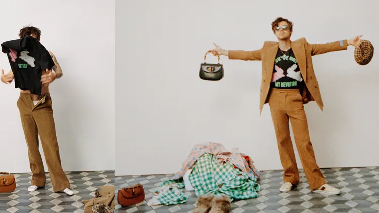 這個系列的設計就是以哈利的「衣櫥」來構思,有著哈利的自由奔放美學精神,還要有十足的玩樂童趣,包括1970年代流行文化、波西米亞風格、英式紳士剪裁等元素,注入於威爾斯格紋大衣、天鵝絨西裝、拼接夾克、喇叭寬褲、印花睡衣、保齡球衫、蘇格蘭百褶裙等,還有小羊、松鼠等可愛動物以及標籤上繡縫的小熊圖案,運用的色彩和圖紋印花更是生冷不忌,提供玩味搭配來催化出無邊風格魅力。