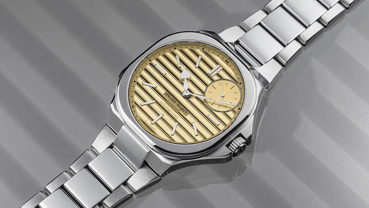 Speake-Marin在今年3月於Temptation系列下推出Ripples腕錶,枕型錶殼搭配圓形錶圈設計,洋溢運動風格,面盤的波浪紋設計也成為一大特色。在品牌20周年之際,即以Ripples腕錶延伸打造20周年紀念錶,採用精鋼錶殼,錶徑40.3mm,面盤則採用18K金材質呈現波浪線條刻紋,閃耀的光彩即如陽光照射下水面反光的漣漪。面盤功能配置有偏心小秒盤,並鑲貼品牌標誌與「2002|2022」的創立年份字樣。