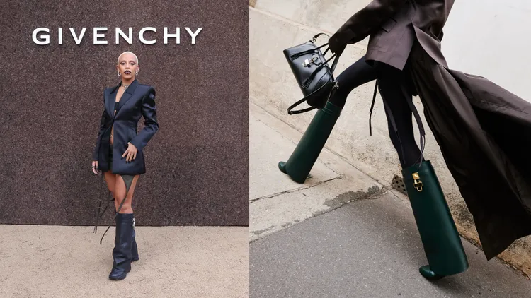 這雙出自GIVENCHY秋冬系列的最新鞋款,由品牌創意總監Matthew M. Williams操刀,備有兩種不同鞋筒高度,外型上看來就像是為靴子圍裹上1層罩衫般,巧妙地遮住了近9公分的楔形鞋跟。如鯊魚身軀般的流暢輪廓,加上鞋身綴有GIVENCHY標誌性的4G logo鎖頭,整體分量感十足,不僅在視覺上讓腿部更顯纖細,更有著使線條無限延伸的效果。