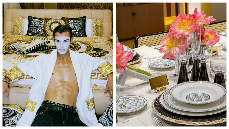 VERSACE 2022假期家居系列以品牌經典圖案印花為設計主軸,包括La Greca希臘迴紋、Crete de Fleur圖案、美杜莎(Medusa)圖像等,以印花、刺繡或水晶鑲綴等手法,以及璀璨金色調,妝點在浴袍、衣物收納袋、靠墊、餐墊、寵物外套、室內拖鞋,以及頸枕、眼罩、拖鞋等旅行用品上,還有鑲滿水晶的美杜莎圖像不鏽鋼隨行杯,囊括多面向的居家生活需求,讓人感受極盡華麗的矜貴氣息。