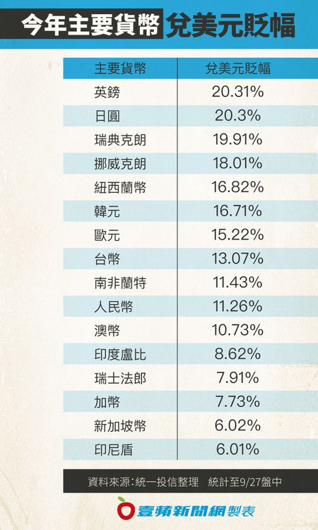 根據投信統計,今年主要貨幣兌美元全面貶值,統計到今天盤中,包括英鎊、日圓兌美元貶值均超過20%,另外,包括瑞典克朗、挪威克朗、紐西蘭幣、韓元、歐元、台幣、南非蘭特、人民幣及澳幣等今天兌美元貶幅也超過10%。