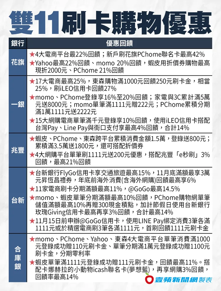合庫銀則是精選五大電商平台,「雙11購物節」期間推出刷卡消費滿額贈活動,於MOMO購物網、PChome線上購物、YAHOO奇摩、東森購物四大電商平台,單筆消費滿1000元登錄成功贈110元刷卡金、單筆分期滿1萬元登錄成功贈1100元刷卡金,再享分期零利率優惠。