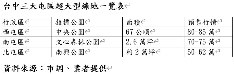 台中人口最密集的三大屯區,包括西屯水湳「中央公園」、南屯七期南側「文心森林公園」、北屯單元十二「南興公園」,皆為2萬坪以上的指標綠地,儼然成為區域焦點,吸引不少對於生活質感有要求的客群接連搶進置產。