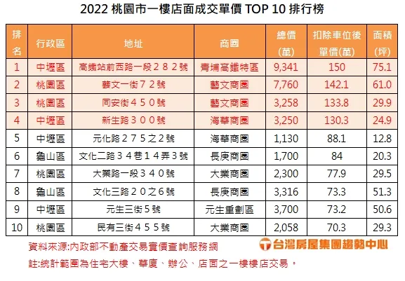 台灣房屋集團趨勢中心協理江怡慧指出,奪下今年桃園單價王的青埔「國際金融雙星」一樓店面,總價9341萬元,總坪數75.1坪,換算每坪成交單價高達150萬元,現為建案銷售接待中心使用。