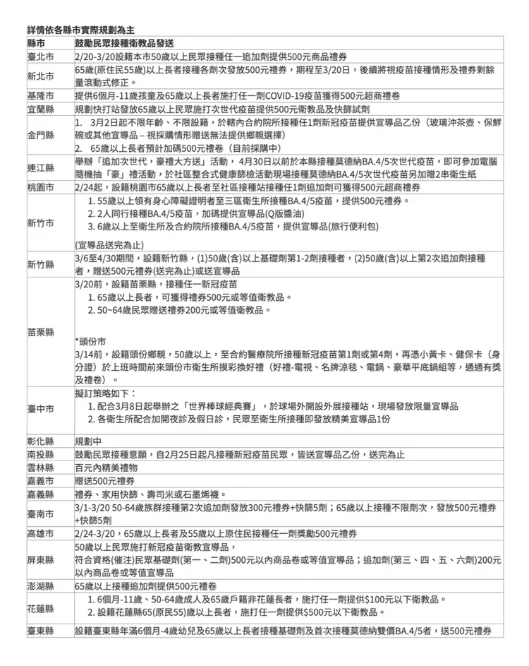 A:各縣市為鼓勵民眾踴躍參與「疫苗+1」,分別推出不同的獎勵措施,符合資格的民眾最高可得到500元的禮券。