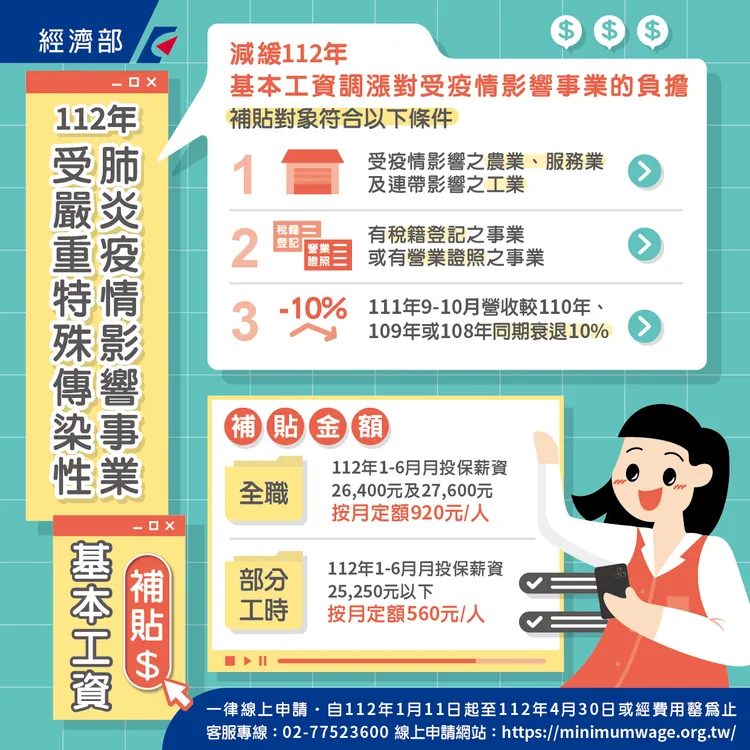 補貼針對事業今年1到6月間受基本工資調整影響的全職及部分工時員工,分別提供每人每月920元及560元的補貼款,並以2022年10月底的員工人數為上限,只要符合補貼條件,1次申請補貼6個月。