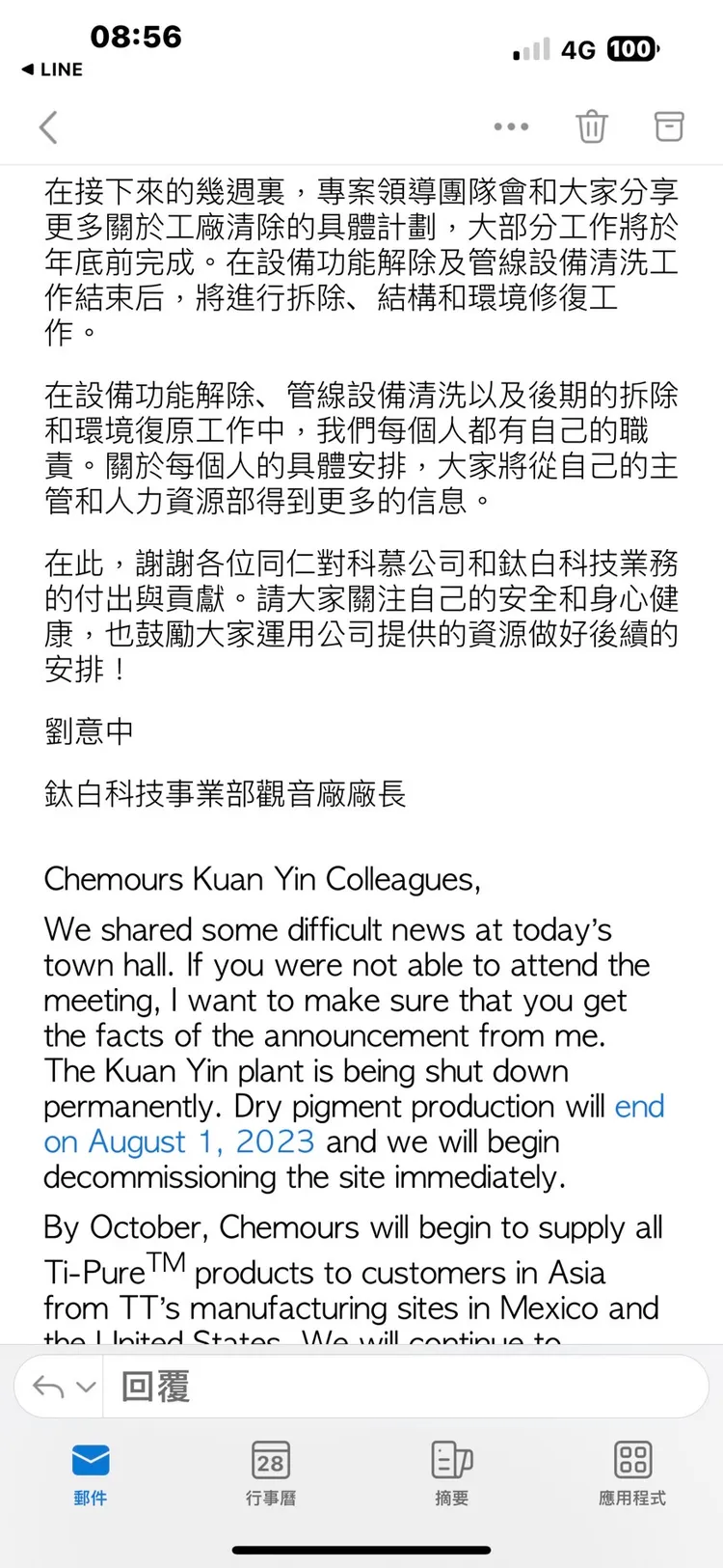 據一封署名鈦白科技事業部觀音廠廠長劉意中的內部信指出,已通知員工關廠計畫,工廠將在8/1結束,亞洲區的供應將改由墨西哥產生產,在年底前,將進行工廠清除計畫,解除設備和管線清洗,以及環境修復工作。